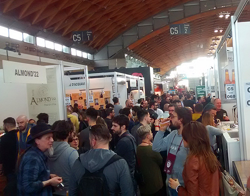 Римини е сравнително малък курортен град на Източното крайбрежие, но пък има абсолютно подходящ конгресен център, който в рамките на четири дни (18-21 февруари) събира за поредна година над 100 местни крафт пивоварни плюс представители на поне още толкова чужди. Освен това едната зала е посветена и на гурме храна, а част от другата пък е отделена за производители на оборудване за пивоварни. Още с отварянето на изложението в 10:00 часа започват да се разливат бири (признаваме си, бяхме едни от първите, които започнаха да пият) като обикновено цената им е 1 жетон (2 евро) за 100 мл. Веднага прави впечатление визията и дизайнът на щандове, бутилки, етикети и рекламни материали – може би едни от най-добре и стилно изглеждащите бири в света. Разбира се, при някои външния вид е подвеждащ, но пък след няколкочасова обиколка категорично изпъкват Opperbacco, Piccolo Birrificio Clandestino, Birrificio Italiano, както и най-вече barrel aged серията им Barbarrique, Brewfist (налични в момента в магазина ни, а скоро и онлайн), Del Ducato, Toccalmato (и двете бяха достъпни в София преди около две години), Lambrate и Candiguerra, които точно бяха изкарали колаборацията си със сърбите Kabinet.